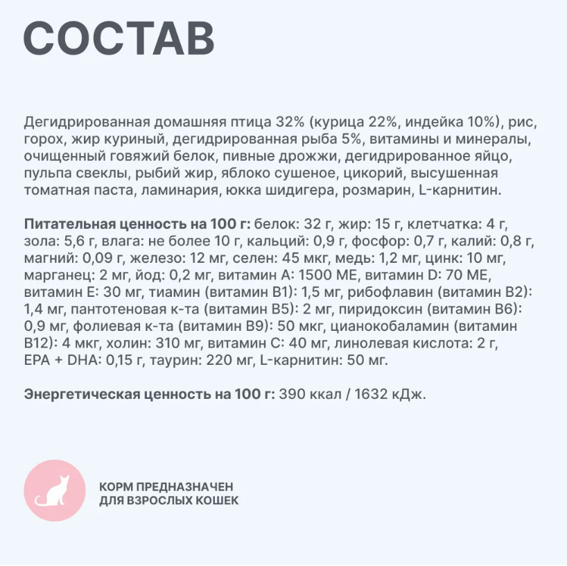 СоставnДегидрированная домашняя птица 32 % (курица 22 %, индейка 10 %), рис, горох, жир куриный, дегидрированная рыба 5 %, витамины и минералы, очищенный говяжий белок, пивные дрожжи, дегидрированное яйцо, пульпа свеклы, рыбий жир, яблоко сушеное, цикорий, высушенная томатная паста, ламинария, юкка шидигера, розмарин, L-карнитин.