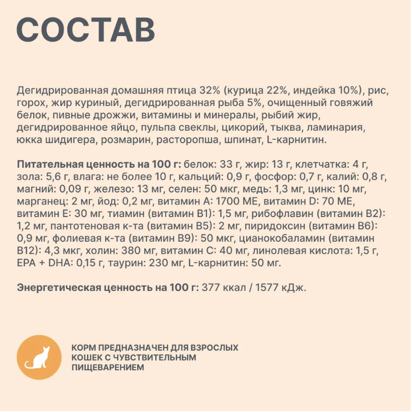 Улучшенная формула: еще больше животного белка и полезных ингредиентов! Мы позаботились и о животных, которые особенно чувствительны к составу корма, и об их хозяевах, которым сложно подбирать корм для своих чувствительных любимцев. Специально разработанная полнорационная формула содержит животный белок повышенной усвояемости, тыкву и шпинат — источники диетической клетчатки, нежные волокна которой не раздражают ЖКТ, рыбий жир для снятия воспалительных процессов в кишечнике и L-карнитин для поддержания здоровья печени питомца. Преимущества: 78,5% высококачественного животного белка в составе. Этот показатель рассчитан ветеринарными диетологами и позволяет обеспечивать организм кошки необходимыми аминокислотами без избыточной нагрузки на почки. Горох в составе обладает низким гликемическим индексом, что позволяет контролировать уровень сахара в крови и способствует профилактике диабета. Это особенно важно для животных с избыточным весом. Натуральная диетическая клетчатка (из тыквы и шпината) не раздражает желудочно-кишечный тракт и поддерживает его функцию. Контроль воспалительных процессов в кишечнике за счет рыбьего жира. L-карнитин и расторопша для поддержания печени питомца и уменьшение интоксикации организма. Ламинария — источник натурального йода, необходимого для поддержания функции щитовидной железы, здоровья кожи и шерсти. Баланс витаминов и минералов для поддержания нормального функционирования всех систем организма. Отсутствие в составе синтетических консервантов, ароматизаторов, усилителей вкуса и ГМО. Соответствие нормам по кормам FEDIAF, NRC и российскому ГОСТу Р 55453-2022. Состав Дегидрированная домашняя птица 32 % (курица 22 %, индейка 10 %), рис, горох, жир куриный, дегидрированная рыба 5 %, очищенный говяжий белок, пивные дрожжи, витамины и минералы, рыбий жир, дегидрированное яйцо, пульпа свеклы, цикорий, тыква, ламинария, юкка шидигера, розмарин, расторопша, шпинат, L-карнитин. Энергетическая ценность на 100 г: 377 ккал / 1577 кДж. Подробнее