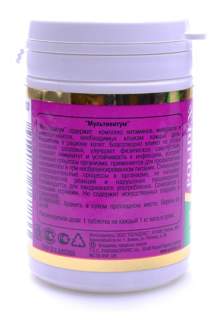 Polidex "Multivitum" предназначен для взрослых кошек (комплекс, содержащий витамины, макро- и микроэлементы).
