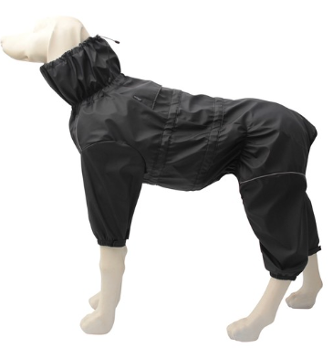 кожи. Такая одежда защитит шерсть животного от дождя и грязи, а непродуваемая ткань - от сильного ветра и холода. Благодаря высокому воротнику и регулировке по линиям шеи и талии костюм-дождевик садится "по фигуре" питомца и не стесняет его движений во время прогулки. Изделие надежно фиксируется при помощи молнии на боку и двух эластичных пряжек, а на штанинах предусмотрены удобные резинки, препятствующие попаданию грязи или налипанию снега снизу. Ширина штанин регулируется за счет липучек. Светоотражающие полоски обеспечивают безопасность питомца в темное время суток. Костюм без подкладки.