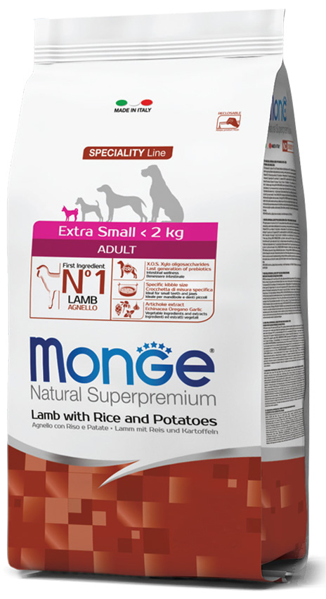 Корм сухой Monge Dog Extra Small Lamb, Rice & Potatoes для взрослых собак миниатюрных пород, ягненок с рисом и картофелем