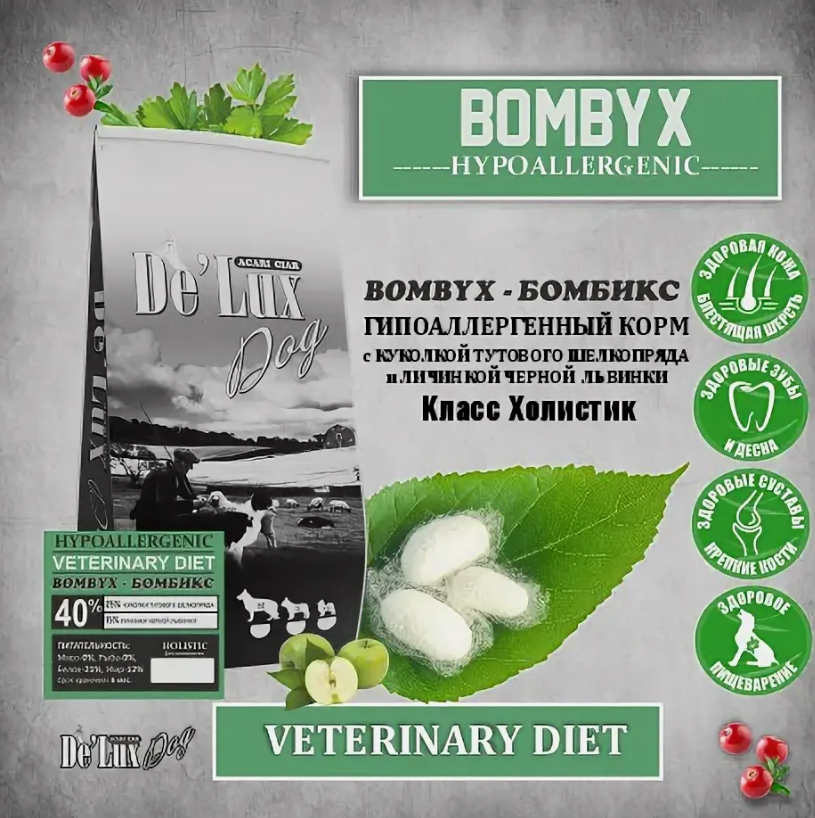 Де`Люкс Дог. Сбалансированный сухой корм БОМБИКС класса HOLISTIC (ХОЛИСТИК) с КУКОЛКОЙ ТУТОВОГО ШЕЛКОПРЯДА для собак с белоснежным окрасом шерсти (Snow White).