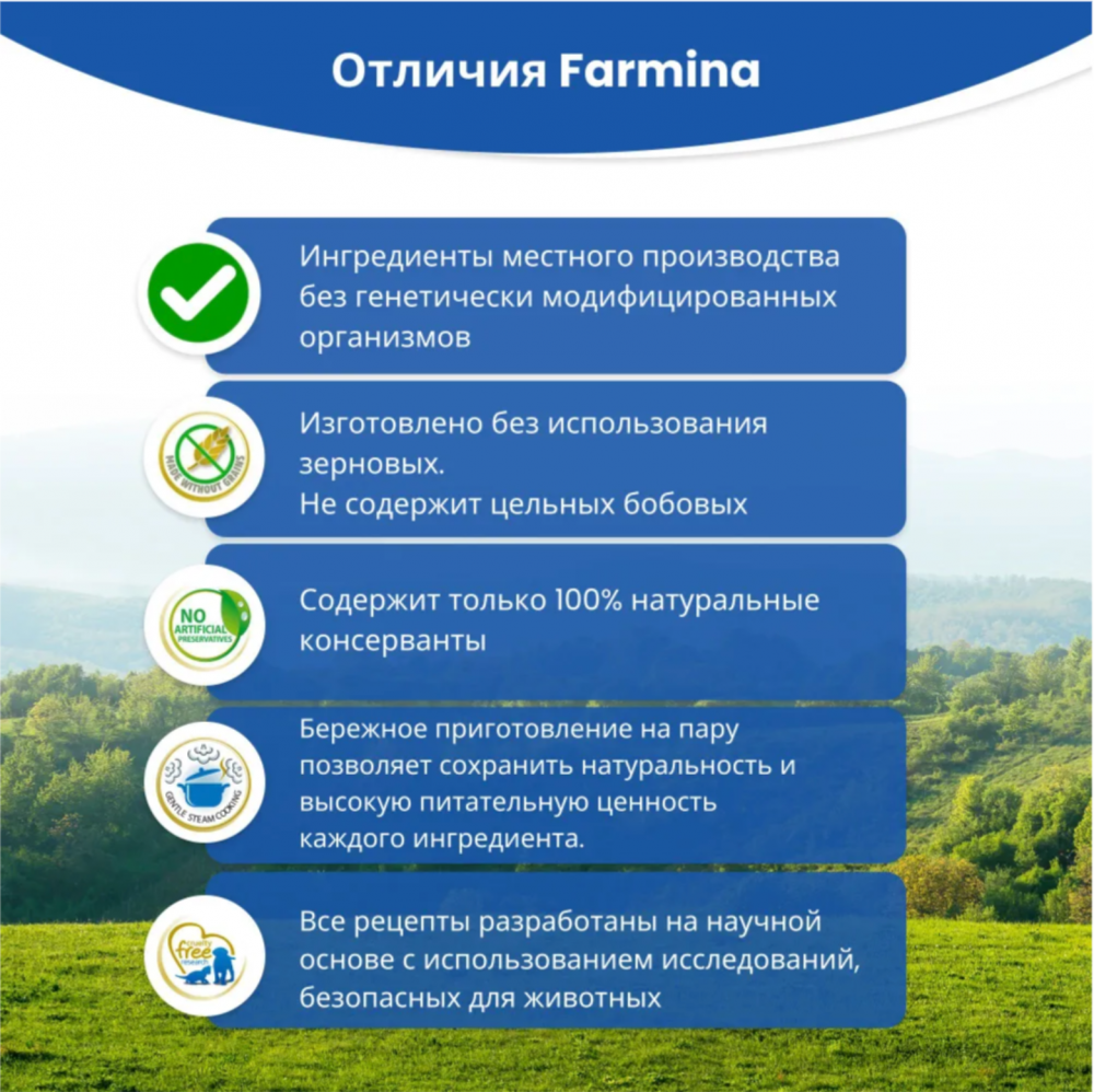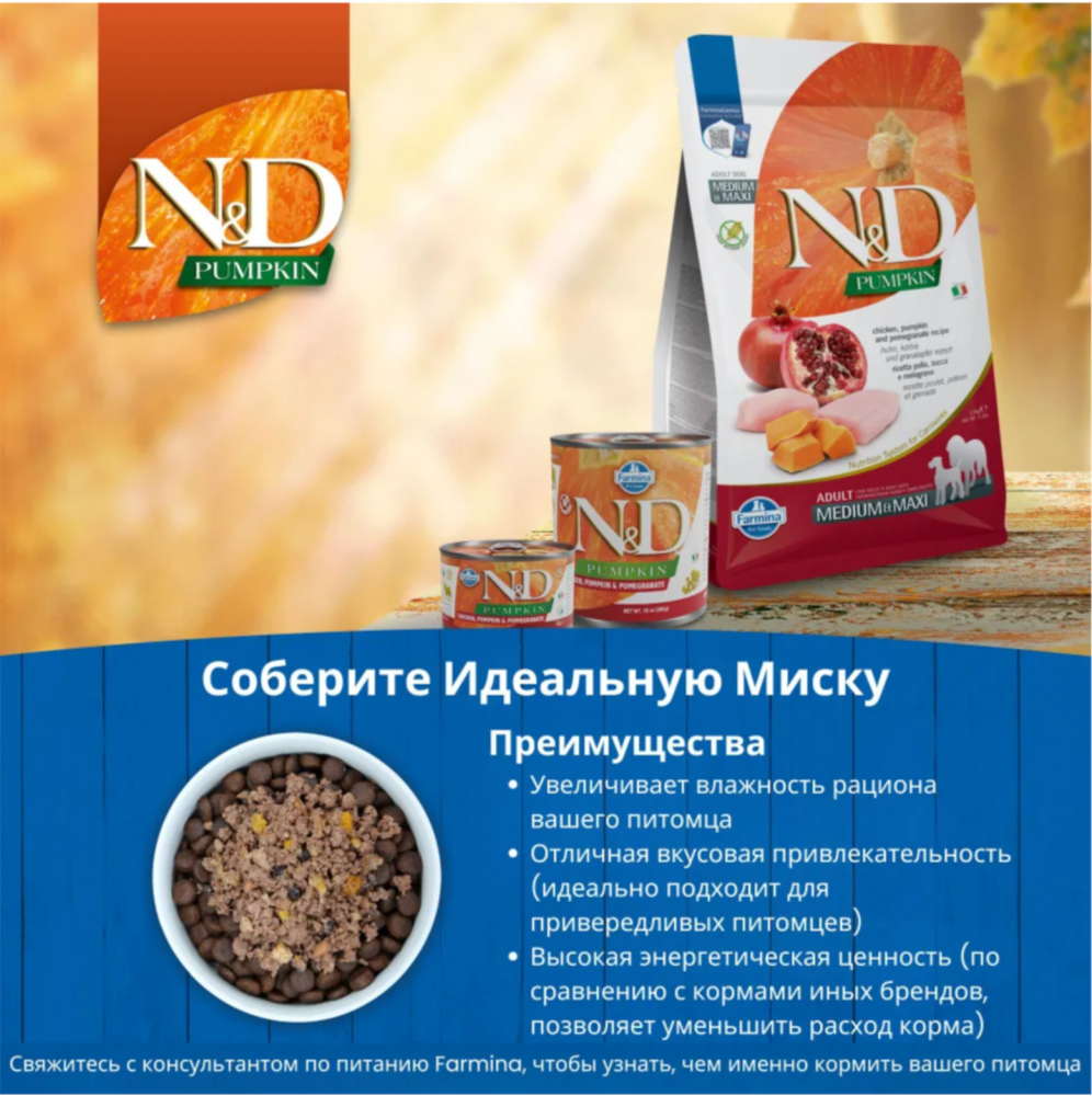 Курица, тыква и гранат. Полнорационный беззерновой сухой корм для взрослых собак. Farmina – это симбиоз науки и природы, миссия в том, чтобы развивать лучшие природные и научно обоснованные системы питания. Используется только первоклассное сырье, вдумчиво смешиваются и готовятся на кухне, поддерживаются методы здорового питания и строго следуя рецептуре, созданной экспертами в питании кошек и собак, которые знают потребности плотоядных. Собаки и кошки, четвероногие члены семьи, дарят эмоции, которые можно получить только дома. Питание – это основа их благополучия, что является необходимым условием их ежедневного счастья и радости. Ингредиенты: свежее куриное мясо без костей (24%), дегидратированное куриное мясо (22%), гороховый крахмал, куриный жир, сушеная тыква (5%), дегидратированные цельные яйца, свежая сельдь, дегидратированная сельдь, рыбий жир (сельди), волокна гороха, сушеная морковь, сушеная люцерна, инулин, фруктоолигосахариды, дрожжевой экстракт (источник маннанолигосахаридов), сушеный гранат (0,5%), сушеные яблоки, сушеный шпинат, подорожник (0,3%), дегидратированный сладкий апельсин, сушеная черника, хлорид натрия, сухие пивные дрожжи, корень куркумы (0,2%), глюкозамин, хондроитин сульфат. Пищевые добавки на 1 кг: Витамин А – 15000 МЕ; Витамин D3 – 1500 МЕ; Витамин Е – 600 мг; Витамин С – 150 мг; Ниацин - 37,5 мг; Пантотеновая кислота – 15 мг; Витамин В2 - 7,5 мг; Витамин В6 – 6 мг; Витамин В1 - 4,5 мг; Витамин Н - 0,38 мг; Фолиевая кислота - 0,45 мг; Витамин В12 - 0,1 мг; Холина хлорид – 2500 мг; Бета-каротин - 1,5мг; Хелат цинка аналогичный метионин гидроксилазе – 910 мг; Хелат марганца аналогичный метионин гидроксилазе – 380 мг; Хелат железа гидрата глицина - 250 мг; Хелат меди аналогичный метионин гидроксилазе – 88 мг; Инактивированные дрожжи – 0,40 мг; DL-метионин – 4000 мг; Таурин – 1000 мг; L-карнитин – 300 мг. Специальные добавки: экстракт алоэ вера - 1000 мг; экстракт зеленого чая – 100 мг; экстракт розмарина. Антиоксиданты: экстракт токоферолов натурального происхождения. Питательные вещества: сырой белок - 30,00%; сырой жир и масла - 18,00%; сырая клетчатка - 2,90%; влага – 9,00%; сырая зола - 7,00%; кальций - 1,20%; фосфор - 0,90%; Омега-6 - 3,30%; Омега-3 - 0,90%; докозагексаеновая кислота (DHA) - 0,50%; эйкозапентаеновая кислота (EPA) - 0,30%; глюкозамин – 1200 мг/кг; хондроитин сульфат - 900 мг/кг. Рекомендации по применению. Нормы кормления указаны в таблице на упаковке. При переводе на N&D рекомендуется постепенно замещать предыдущий корм на новый. Хранить в прохладном, сухом месте, в закрытой упаковке. Произведено за 18 месяцев до окончания срока годности, указанного на упаковке. Подробнее