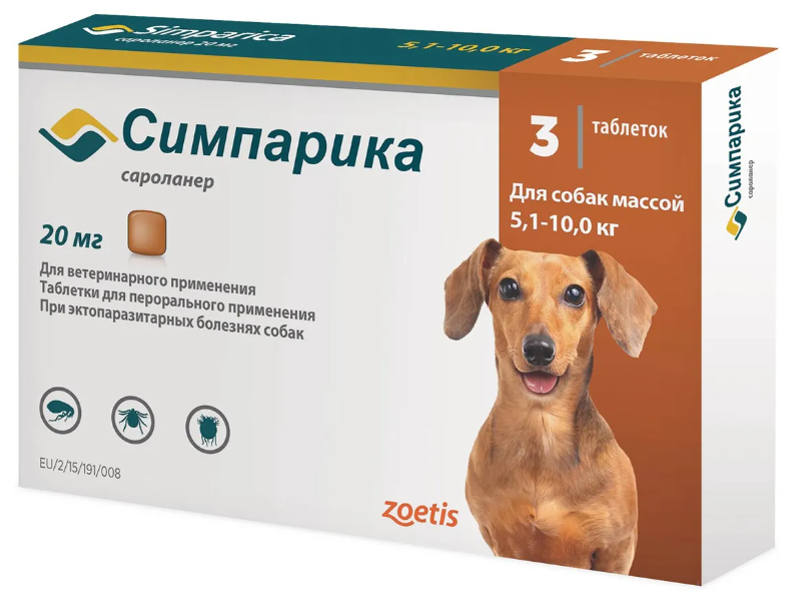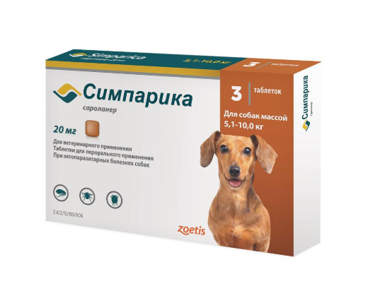 Таблетки Zoetis Симпарика 20мг от блох и клещей для собак 5-10 кг (1 таблетка на 5 недель), 3 таблетки. Турция
