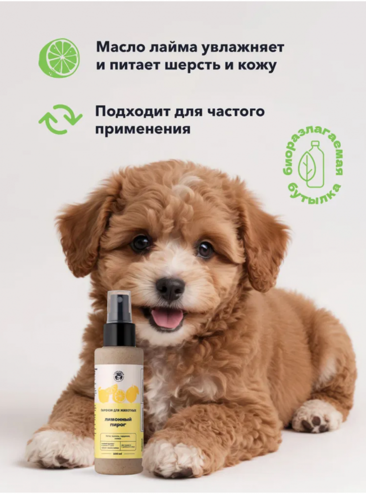 Парфюм для животных с ярким ароматом лимонного пирога создан на основе безопасных компонентов для применения в груминг салонах и дома.