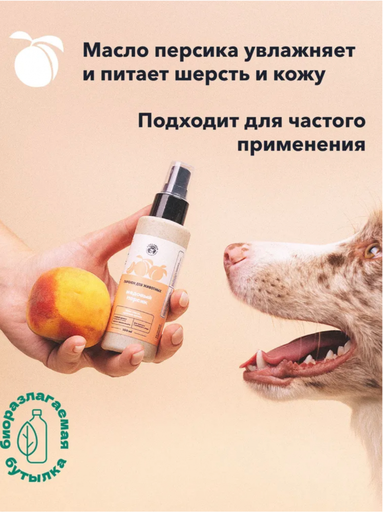 Парфюм для животных с солнечным ароматом медового персика создан на основе безопасных компонентов для применения в груминг салонах и дома. Масло персика увлажняет и питает шерсть и кожу.