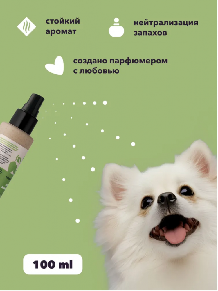 Стойкий и насыщенный аромат нейтрализует неприятные запахи на шерсти и коже. Шлейф остается на шерсти в среднем 3-5 дней.