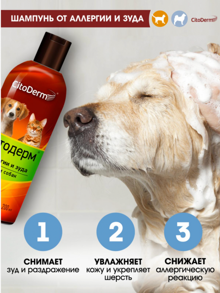 CitoDerm шампунь от аллергии и зуда, 200 мл CitoDerm шампунь от аллергии и зуда создан для ухода за кожей и шерстью животных, склонных к аллергии. CitoDerm шампунь от аллергии и зуда: снимает зуд и раздражение снижает аллергическую реакцию укрепляет естественные защитные свойства кожи против аллергенов Используйте собакам и кошкам: склонным к аллергии для ухода за чувствительной кожей для облегчения симптомов зуда и раздражения при блошином дерматите В состав шампуня входят: диметилсульфон снижает аллергическую реакцию; ментол успокаивает зудящую и раздраженную кожу, уменьшает боль, воспаление и покраснение; экстракт алоэ вера снимает зуд и раздражение, увлажняет кожу и укрепляет шерсть; яблочная кислота снимает отечность кожи, стимулирует обновление ее клеток. Порядок применения: смочите кожу и шерсть животного; нанесите шампунь, слегка втирая его и распределяя по всей поверхности тела до образования пены; тщательно смойте теплой водой; просушите и расчешите шерсть. Подробнее