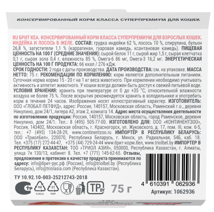 Вся линейка паучей и ламиcтеров Брит Кеа "Волокна в желе" построена на индейке как основном белке, с добавками разных морепродуктов. Это уникальная фишка линейки — моно-белковый состав на базе индейки + сочные волокна и желе, обогащенные спирулиной и таурином, создающие функциональное лакомство для взрослых кошек и котят. Сочетание
