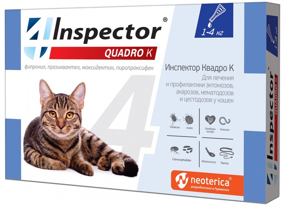 Наши кошки находятся под постоянной угрозой заражения эктопаразитами (клещи, блохи и др.) и эндопаразитами (гельминты, в простонародье «глисты»). Для надёжной и всесторонней защиты от внешних и внутренних паразитов используйте препараты Inspector. Inspector — комплексный препарат 2 в 1. Один от всех! Inspector Total K для кошек эффективен от 14 видов наружных и внутренних паразитов. Inspector Total K защищает кошек: ✔ 1 месяц от: – Иксодовых клещей (переносят гемобартонеллез и др. болезни) – Круглых гельминтов (нематод) и их личинок – Ушного клеща (отодектоза) – Подкожных клещей (нотоэдроза) – Сердечных гельминтов (микрофиллярий в крови) ✔ 1,5 месяца от: - Блох, власоедов Используйте Inspector Total K кошкам любых пород: ✔ Ежемесячно ✔ С 7 недель ✔ От 1 кг веса ✔ Беременным и кормящим Способ применения: Нанесите Inspector на кожу в области холки (между лопатками), максимально раздвигая шерсть. Не растирайте препарат пальцами. Не рекомендовано мыть животное 2 дня до и 4 дня после обработки. Подробнее: см. инструкцию по применению препарата. Состав: фипронил — 10% и моксидектин — 1% Состав разработан компанией Neoterica (Германия). Срок годности: 3 года со дня производства, по истечении срока годности применяться не должен. Условия хранения: хранят препарат в закрытой упаковке производителя, в защищенном от прямых солнечных лучей месте, отдельно от продуктов питания и кормов, при температуре от 0 °С до 30 °С и относительной влажности воздуха не более 60%. Подробнее