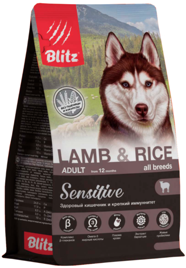 В основе кормов Blitz Sensitive для собак - низкоаллергенные источники животного белка, представленные ягнёнком, индейкой и свининой, а так же редко вызывающие аллергию рис, кукуруза и ячмень. Дополнительное обогащение пробиотиками, маннано- и олигосахаридами (MOS и FOS), Омега-3/6 жирными кислотами в комплексе поддерживает здоровье желудочно-кишечного тракта, снижая риск нежелательных реакций. В линии кормов Blitz Sensitive вы можете подобрать корм для собак любого возраста или породы, будь то быстро растущие малыши или взрослые животные. Также линейка включает и специальный продукт для собак мелких пород с уменьшенным размером гранул. Подробнее